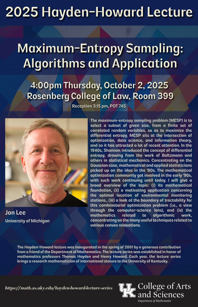 The Hayden-Howard lecture was inaugurated in the spring of 2001 by a generous contribution from a friend of the Department of Mathematics. The lecture series was established in honor of mathematics professors Thomas Hayden and Henry Howard. Each year, the lecture series brings a research mathematician of international stature to the University of Kentucky.
